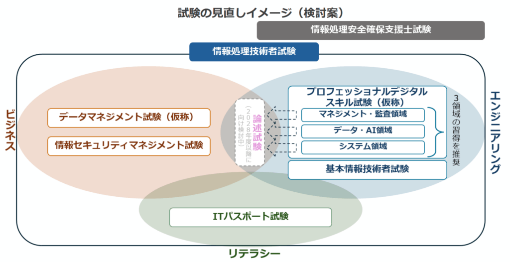 - 情報処理技術者を対象とする試験のうち、従来のITSSレベル3とレベル4に対応する試験(応用情報技術者試験と高度試験)が、2レベルを統合する新しい試験「プロフェッショナルデジタルスキル試験(仮称)」になる