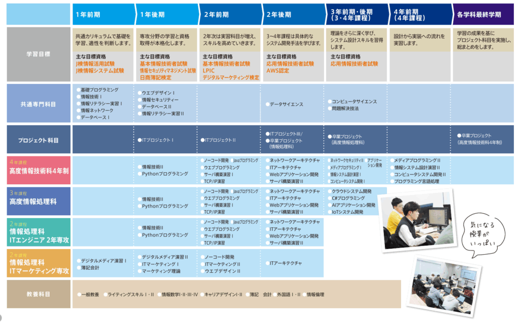 本校のカリキュラムは、1年次前期(最初の3ヶ月)は共通専門科目でITの基礎を学びます。その上で学科・専攻を正式決定します。学習状況や適性を元に専攻を決めることで、専門選択のミスマッチを防ぐことができます。