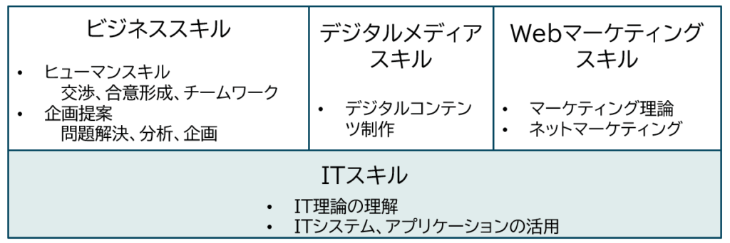 ITスキルをベースに、「デジタルメディアスキル」、「Webマーケティングスキル」、「ITビジネススキル」を習得します。