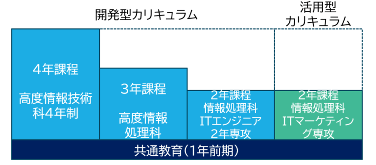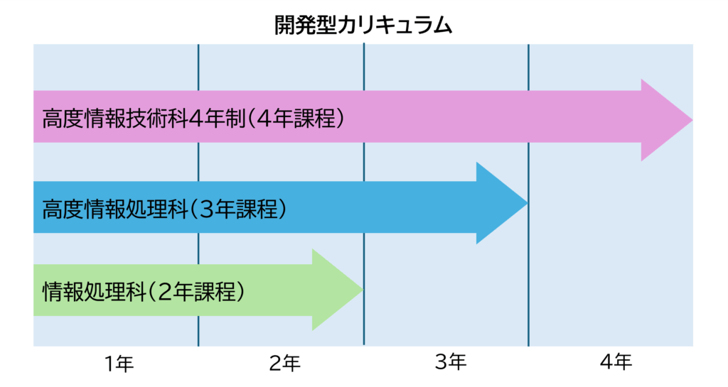 カリキュラムは、共通する基礎を学んだ後、「開発型」と「活用型」に分かれる構成です。開発型カリキュラムは1本のルートで、どこまで学ぶかが修業年数の違いになっています。