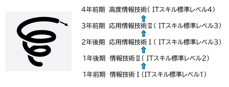 理論学習(情報技術者試験対策)やプログラミング言語学習では、授業科目をスパイラル型に構成しています。