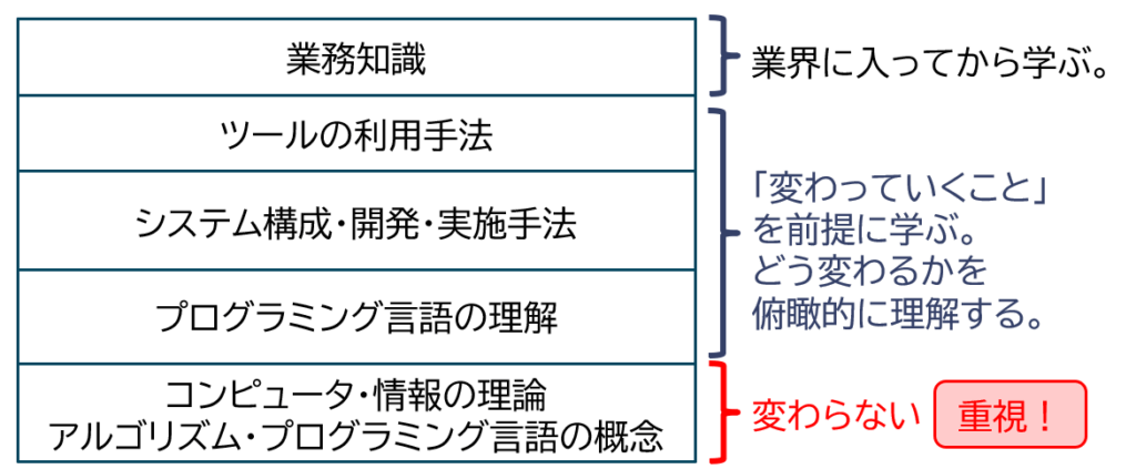 開発型カリキュラムは一本の構成で、職種・分野では分かれていません。これは今後の開発系IT専門家には、プログラミング・システム設計・ネットワーク・データベースなど、多くのIT分野を幅広く身につけておく必要があると考えているからです。