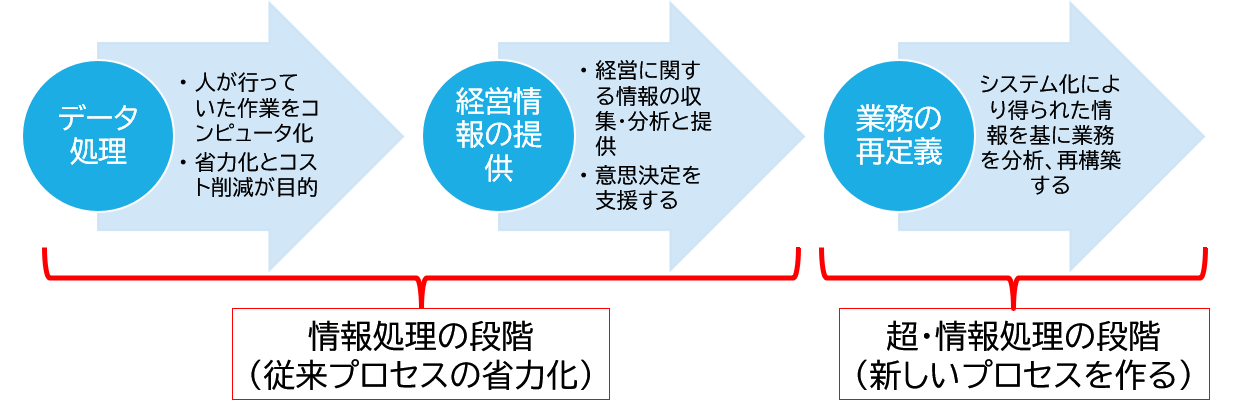 ITを活用すると情報の扱い方・流れ方が変わるので、結果としてプロセスが変化します。例えば企業では、「仕事の進め方」が変わっていきます。これが「DX」と呼ばれている考え方です。