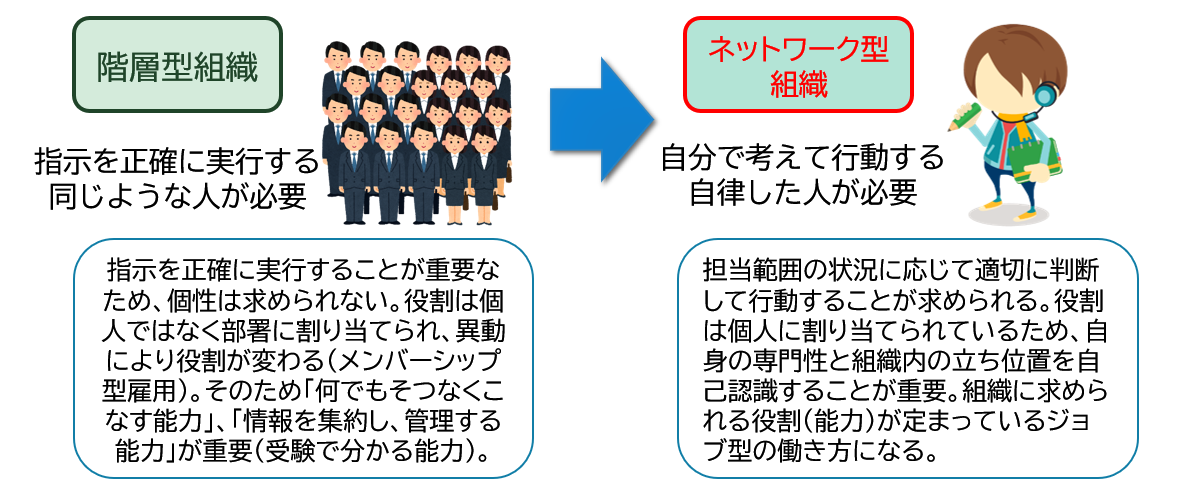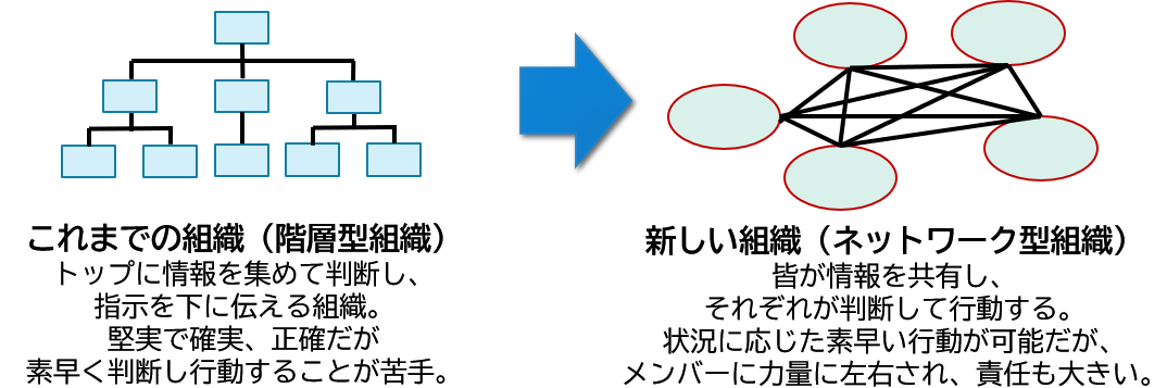 ITの進歩により、従来の「階層型組織」だけでなく、「ネットワーク型組織」も実現可能になりました。この2つの組織では、メンバーに求められる資質が異なっています。