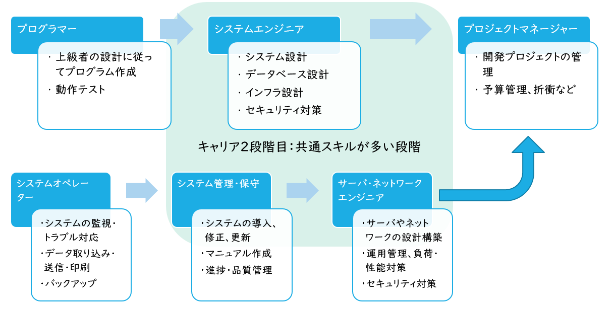 IT専門家は、一つの業務だけをずっと続けるわけではありません。経験を積みながら、ステップアップしていきます。いろいろな業務がありますが、それらをどんな経路で進んでいくかがキャリアパスです。