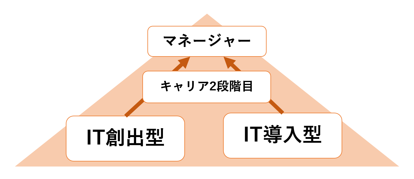 下の図が、典型的なキャリアパスです。キャリアの入り口は、「IT創出型」と「IT導入型」で異なります。