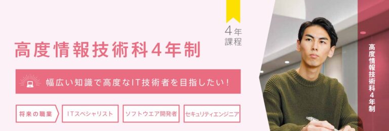 高度情報技術科4年制の入学選考では適性試験を行うので、入学後の学習に対応できるかどうか、そこで判断することが出来ます。また、入学後に学科を変更することが可能であるため、2~3年課程に入学し、1年次の学習成果をみてから4年課程に変更することが可能です。